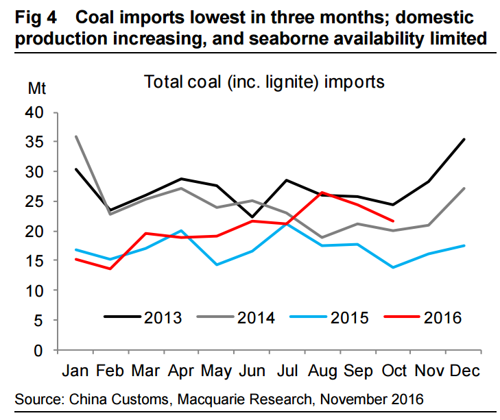 China coal (including lignite) imports dropped 15% MoM but surged 55% YoY to 21.58mt, and YTD coal imports have jumped 18.5% YoY thanks to reduced China domestic supply after the “276 days” rule. We believe a domestic mine supply increase began last month following the adjustment of the rule in September, and calculated import loss for thermal coal has deteriorated since late-October. Latest news