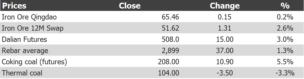 Tianjin benchmark rose 0.2% to $64.50 Paper went nuts again overnight, hitting to new highs. Steel still has pricing power and so long as it does the rally can persist. Coking coal futures also took off. But thermal coal appears to have topped out after China forced local producers to cut prices. Why it does do the same with coking coal I have no idea!
