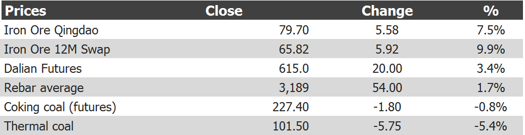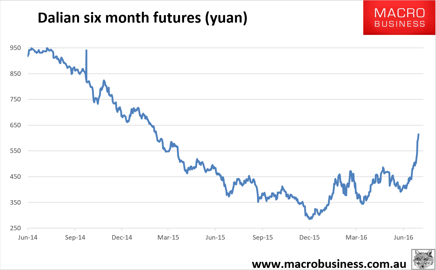 Tianjin spot is…what it is at $79.70. Futures are…what they are. Coking coal futures got pretty heated again as well. Thermal coal has topped and will sink from here. Port stocks fell nearly 1mt last week, I’d guess because mills are desperate to buy from anywhere but the seaborne market. Steel added more but is being blown away by iron ore which had its best week ever, rising 23%. Mill margins have collapsed to boom lows.
