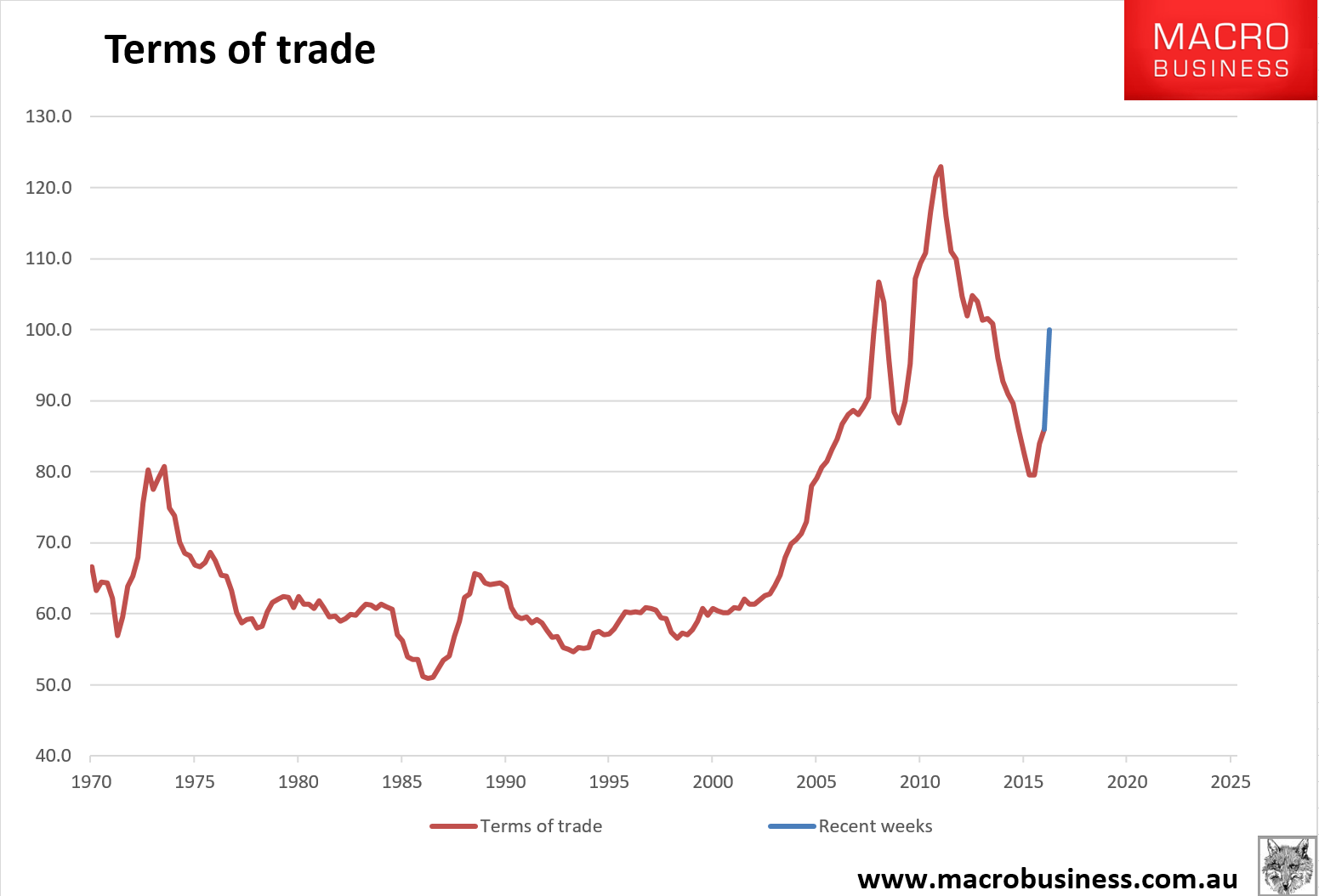 Australia’s terms of trade thus rose 8 points last week alone and the past three quarters is roughly the equivalent of the entire 1970s Japanese iron ore boom: