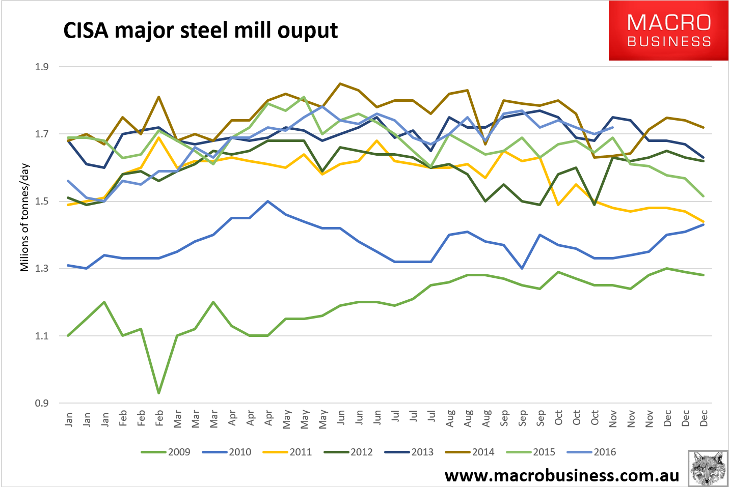 Tianjin benchmark crashed -6.4% to $75.10. Iron ore paper crashed -4.5% yesterday and is limit down another -6% overnight. Coking coal futures crashed limit down. Rebar held up but futures crashed. Thermal coal crashed. CISA steel output for the first ten days of November lifted 1.2% to 1.72mt. I expect a slow decline into year end.