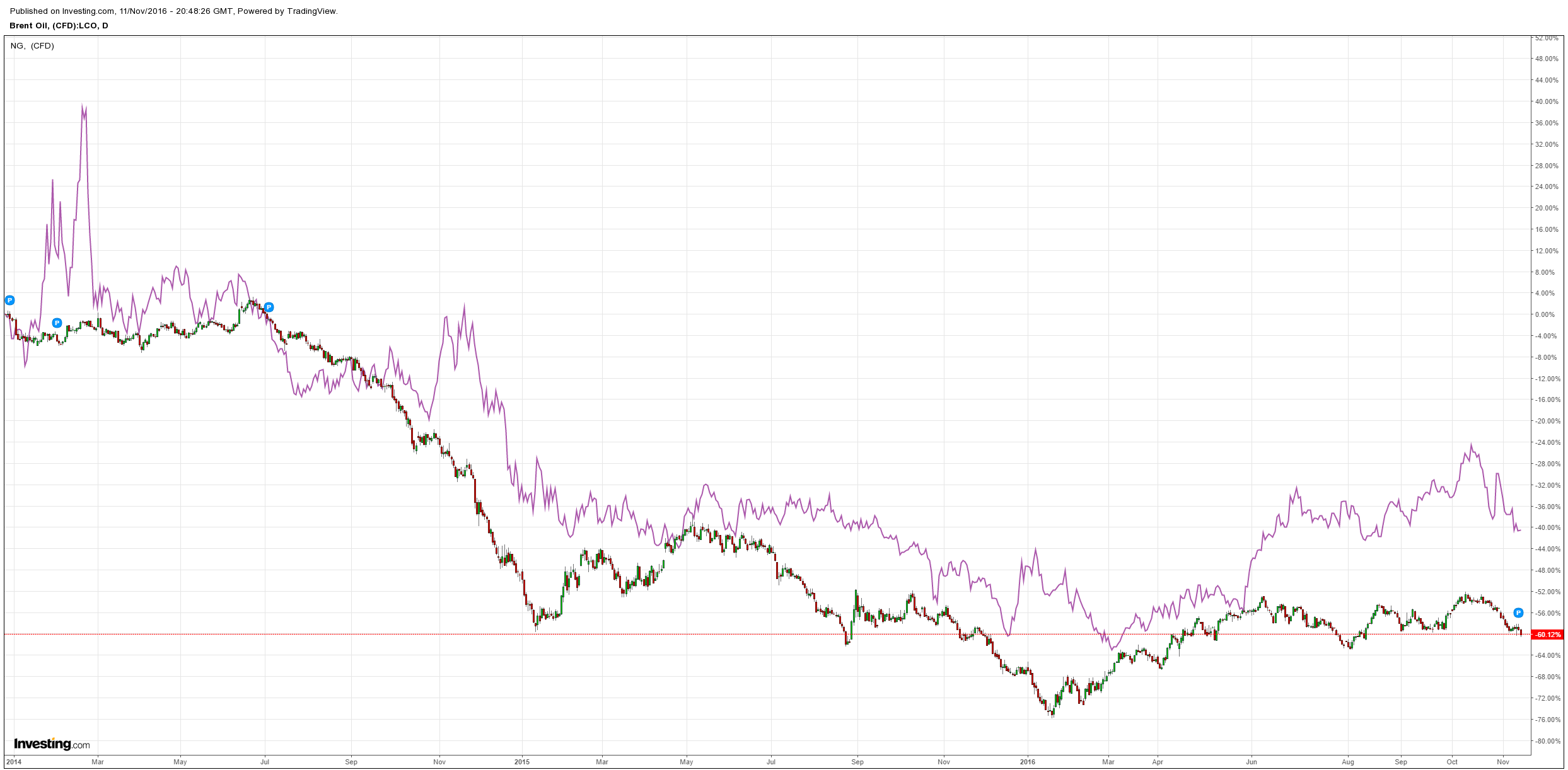 The Brent oil price was hammered lower Friday night to $44.56. Henry Hub held on at $2.63mmBtu: