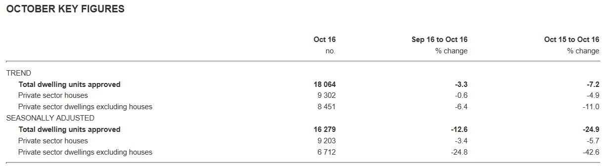 In the year to October 2016, dwelling approvals fell by a seasonally-adjusted 24.9%, with unit approvals down by 42.6% and detached house approvals down by 5.7%: