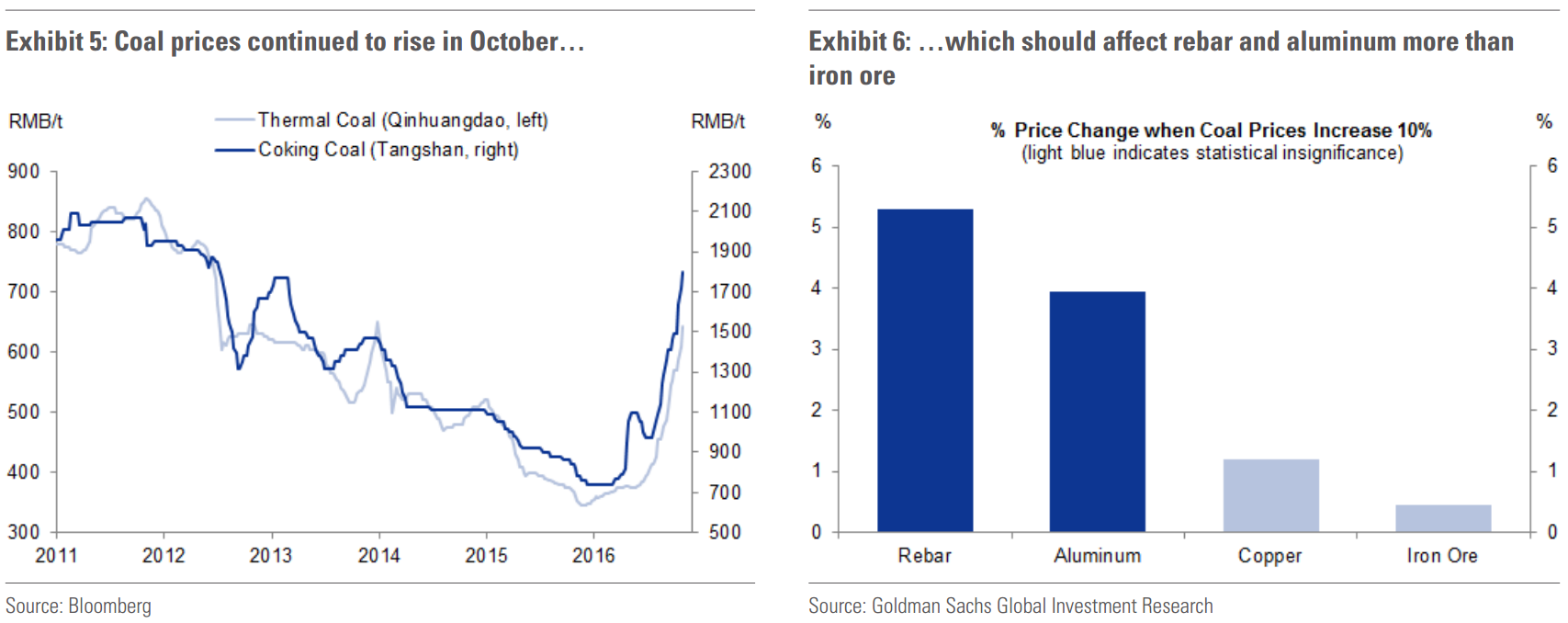 Because coal is an input for the metals industry, higher coal prices can be passed onto end-users via higher metal prices. To test if this is the main driver of the October ferrous rally, we look at the historical relationship between movements in coal prices and movements in the prices of iron ore, rebar, copper and aluminum. Our estimates show that the effect of coal prices is the largest for rebar and aluminum, but small and insignificant for copper and iron ore (Exhibit 6). This result makes intuitive sense since metallurgical coal is a key input for steel making and aluminum smelting relies on coal-fired power generation. From a fundamental perspective, more expensive steel, when driven by higher coal prices, should not boost the demand for iron ore. But in the short run, behavioral explanations such as the belief that iron ore prices should follow steel prices could affect the market.