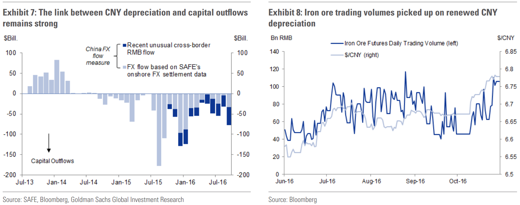 There are reasons why iron ore may be the first in line to benefit from onshore investment flows into commodities amidst renewed CNY depreciation. For example, the iron ore futures curve is almost always backwardated, making long iron ore a positive-carry trade. To the extent that a higher $/CNY also leads to a weaker local currency on a trade-weighted basis, iron ore may benefit from potentially higher Chinese steel exports. Additionally, rebar and iron ore are the most traded commodities in the onshore futures exchanges. Exhibit 8 shows the positive correlation between iron ore futures trading volumes and the $/CNY in recent months. By our estimates, about 60% of the iron ore price rally in October can be explained by the CNY depreciation.