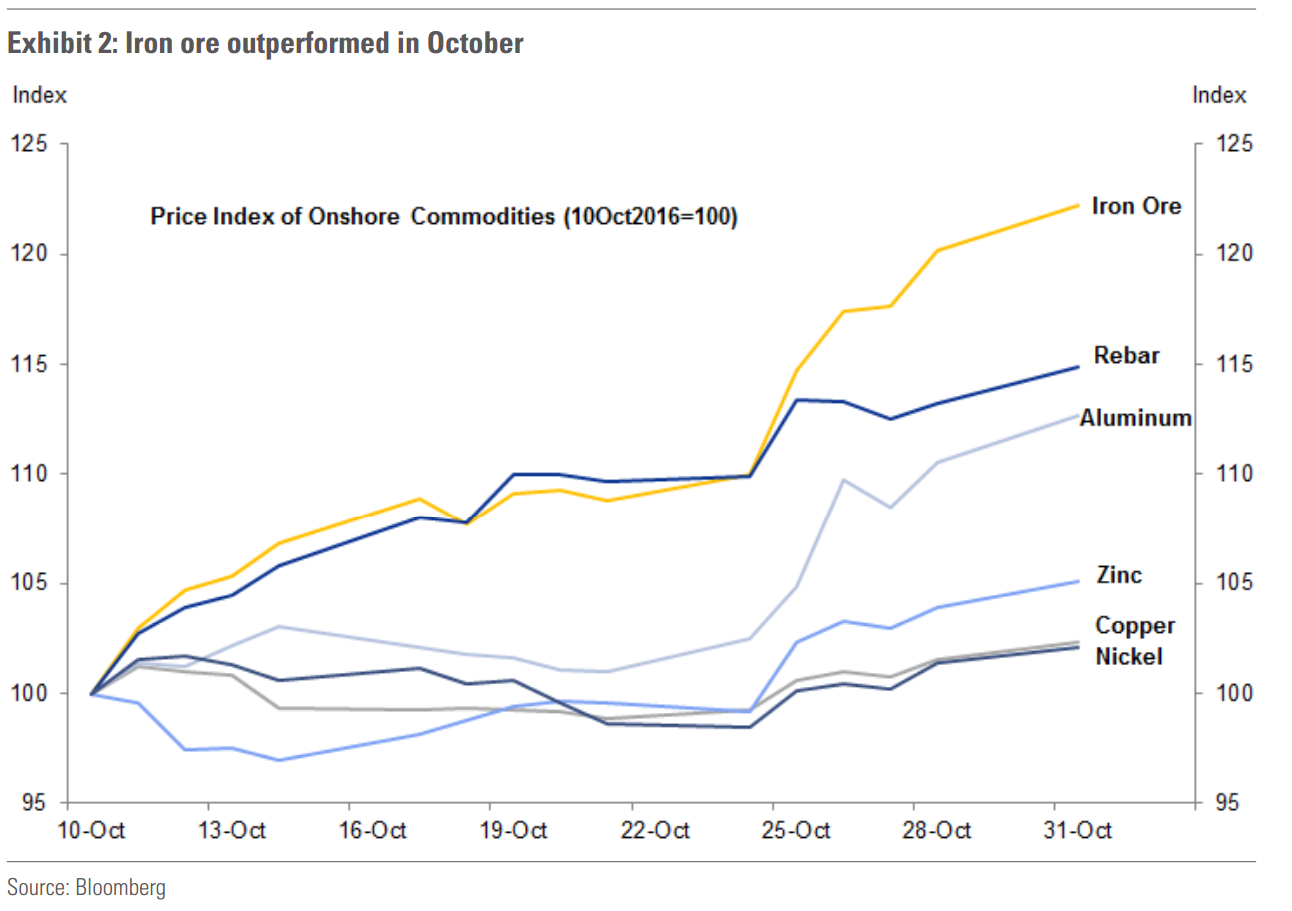 Over the past three weeks, iron ore in the Chinese onshore market experienced an impressive 22% price gain and outperformed other commodities (Exhibit 2). At the same time, there have been several new economic and market developments in China. The September credit data released in mid-October surprised to the upside. Coal prices continued to climb despite recent government announcements to encourage production. After pausing in Q3, CNY resumed its depreciation against the US Dollar. Do these developments help explain the October ferrous rally? In this note, we examine the contribution of the three factors –growth expectations and supply/demand fundamentals, coal prices, and $/CNY – to the recent iron ore price rally. We conclude that the weaker currency may be the most important driver.