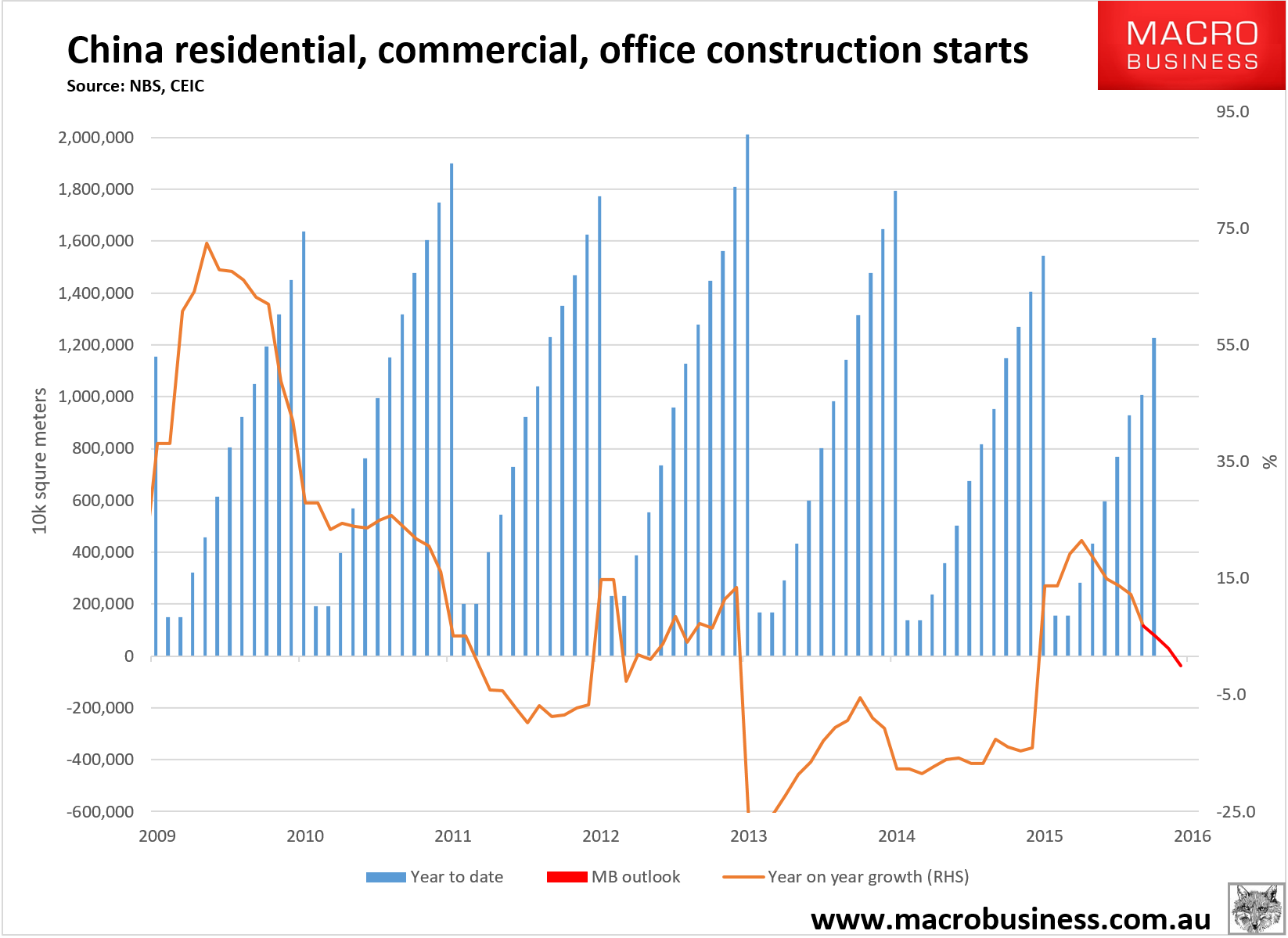 I don’t think so. My own outlook for iron ore this year has proven too bearish even as I got coal right. But the evidence still points towards a full correction of the current terms of trade boomlet and then even more downside. The key is Chinese construction starts which continue to decelerate quickly as expected: