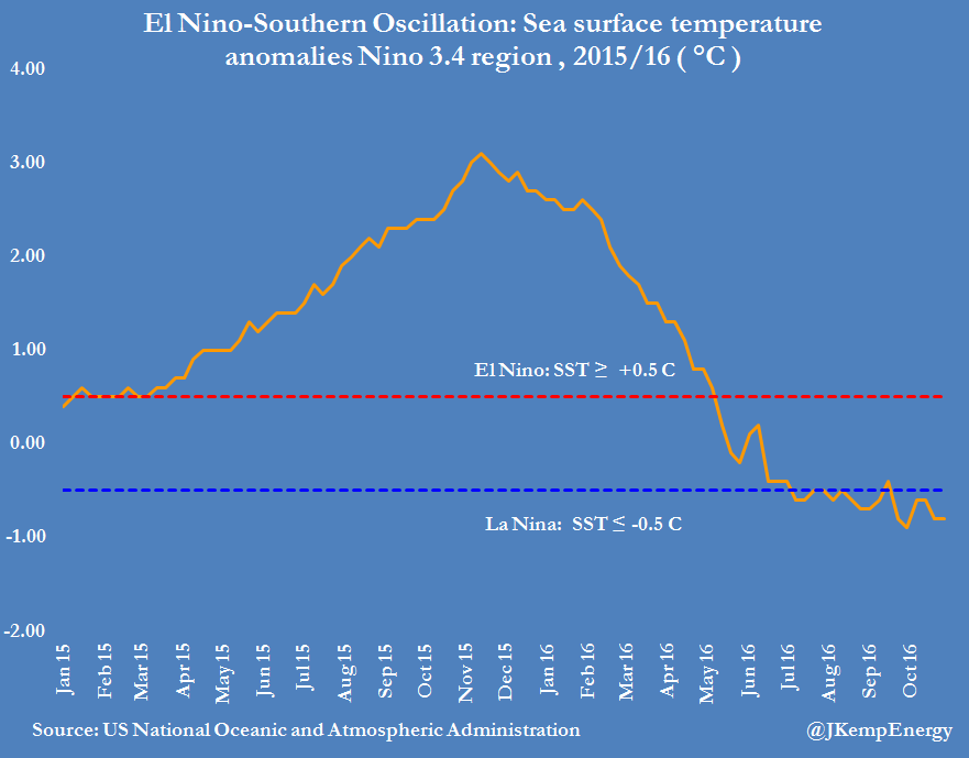 Australia’s Bureau of Meteorology has forecast a 67% chance of having more than the average 11 tropical cyclones over the 2016/17 season from November to April due to the prevailing weak La Niña conditions in the tropical Pacific Ocean. In terms of the geographic split, Western Australia is expected to have at least two tropical cyclones to make landfall. Last season was the least active on record, with only one cyclone that hit the WA coast at the end of January. Meanwhile the coast of Queensland is forecast to see up to eight cyclones form, with only one or two likely to make landfall. This could have negative implications for iron ore supply from WA and met coal supply from Queensland. The first quarter of each year is typically weakest for seaborne supply for both commodities due to wetter weather, and with conditions expected to be more adverse than usual, these markets could stay tighter for longer.