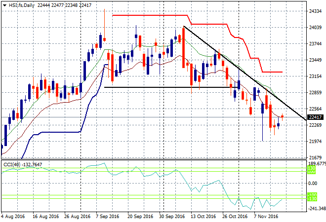 The Shanghai Composite is down a few points as the lunch break unfolds, hovering just above 3200 points in a very small correction that was warranted given the recent breakout. The Hong Kong based Hang Seng is up 0.6% at 22461 points, but still no indication yet that’s its correction is over with the downtrend line still intact, but a possible long swing brewing here: