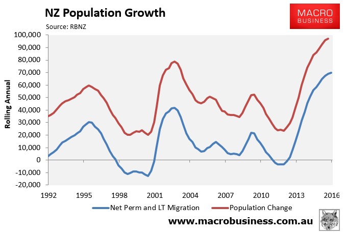 Last month, New Zealand’s immigration data for September was released, which confirmed that net migration into the country had hit a record high 70,000 people over the year, which has driven the country’s population growth to all-time highs (see below chart).
