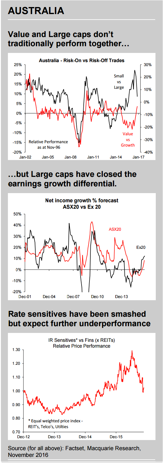 Market: Australian equities will trade 7.5% higher in 2017 (ASX200 at 5875) supported by a gradual improvement in the domestic economy and as risk taking behaviour remains supportive for equities over bonds. A modest index return expectation hides a significant return skew as cyclicals outperform rate sensitives, value outperforms growth and large caps outperform small-mid caps.