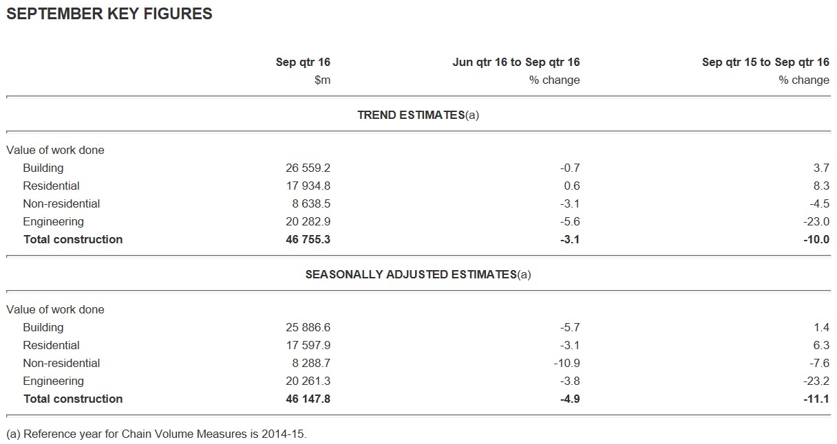 The ABS has released data on the value of construction work done for the September quarter of 2016, which registered a seasonally-adjusted 4.9% fall in total construction activity over the quarter and a 11.1% decline over the year.