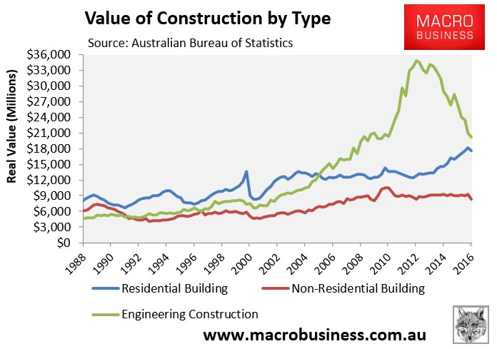 The 4.9% quarterly fall in construction activity was broad-based with engineering construction (mostly mining-related) falling by 3.8% in real terms, whereas building construction fell by 5.7% over the quarter, with residential construction falling 3.1% and non-residential construction falling 10.9% (see below chart).