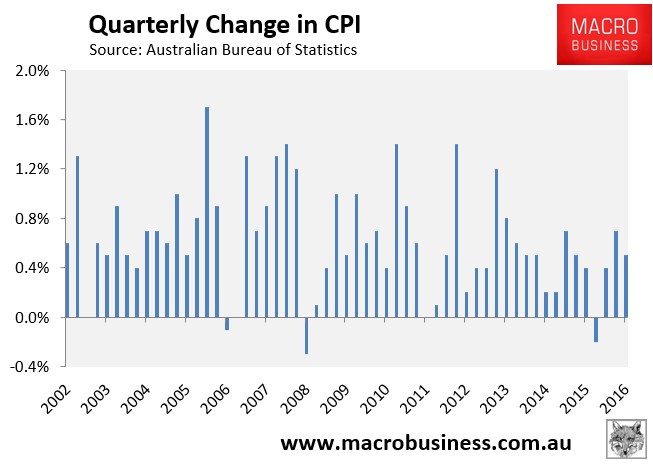 According to the ABS, headline CPI rose by 0.5% in the December quarter, down from the September quarter’s 0.7% rise (see next chart).