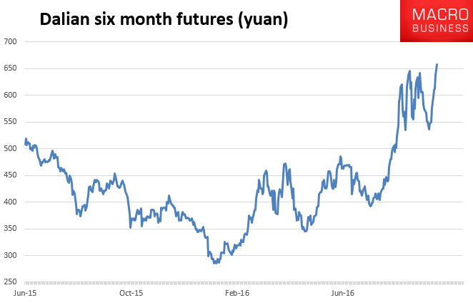 Spot iron ore prices just zoomed past the September 2014 high with futures off the charts as well: