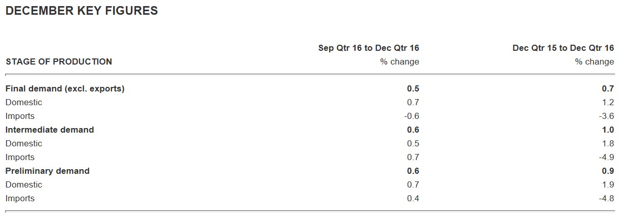 The Australian Bureau of Statistics (ABS) today released Producer Price Index (PPI) data for the December quarter, which registered a 0.5% quarterly rise in final (stage 3) prices and an increase of only 0.7% over the year: