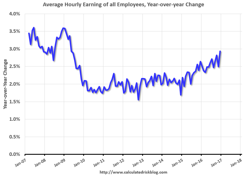More from Calculated Risk, where the reason the market digested the print well – US stocks made a new high and the USD was bid against all the major currencies – was due to a big increase in average hourly earnings: