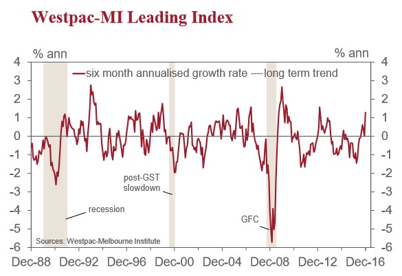 Westpac is comfortable with its forecast of 3% growth through 2017. That growth rate is above trend and consistent with the positive leads from the Index over the last five months.