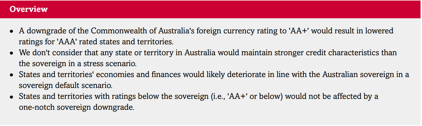 In this article, we address frequently asked questions from market participants about how a potential sovereign rating downgrade would affect our ratings on Australia’s states and territories. In July 2016, S&P Global Ratings revised to negative from stable its outlooks on the ‘AAA’ rated State of New South Wales, State of Victoria, and Government of Australian Capital Territory after a similar action on the Commonwealth of Australia (see “Australia Outlook Revised To Negative On Growing Fiscal Vulnerabilities; ‘AAA/A-1+’ Ratings Affirmed,” published on July 6, 2016).