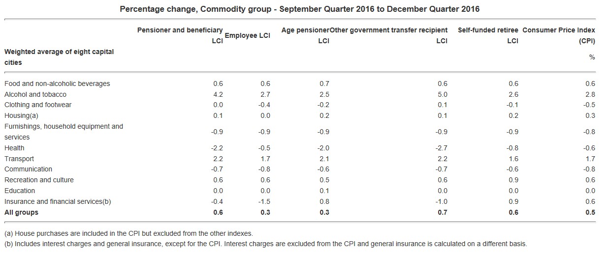 For households headed by Australians on benefits, old age pensioners and self funded retirees the cost of living rose by 1.8%, 1.6% and 1.4% respectively over the year.