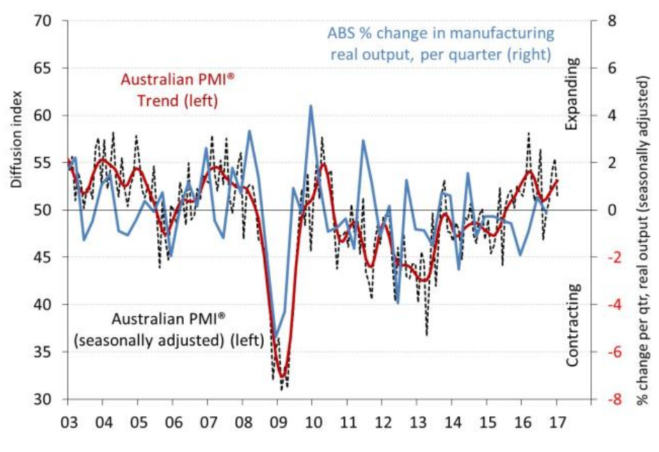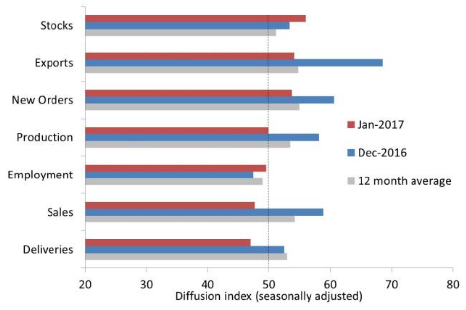 The Australian Industry Group Australian Performance of Manufacturing Index (Australian PMI® ) has expanded for a fourth consecutive month, with a reading of 51.2 points in January, albeit down by 4.2 points since December (results above 50 indicate expansion and the distance from 50 points indicates the strength of expansion). This adds to the solid growth seen at the end of 2016.