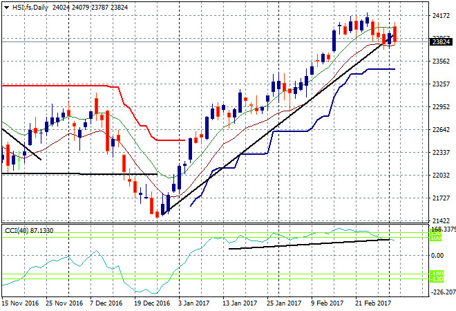 The Shanghai Composite closed down 0.5%, taking back yesterdays gains to be at 3230 points. The Hang Seng Index conversely is higher, up 0.4% to 23,880, still a little bit below the 24000 points level. The daily chart is still suggesting what looks like a top here as price hovers around the low daily moving average and below the daily trendline: