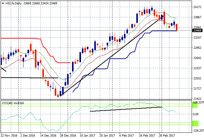 The Shanghai Composite is off nearly 1% going into the close, down to 3216 points, only just above local support at 3200 level. The Hang Seng Index is worse off, down 1.2% to 23496, still below the 24000 points resistance level and dicing with the daily ATR support level at 23500: