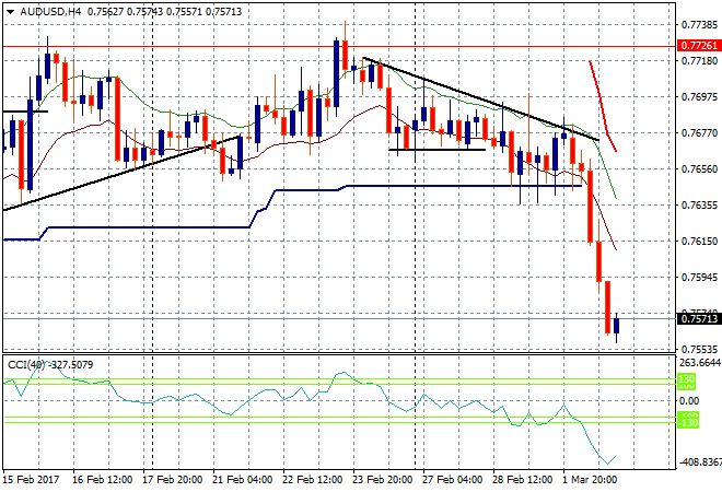 The Aussie dollar slumped through the support level I indicated yesterday in Macro Afternoon at 76.40 providing an excellent payday overnight for short sellers (hello, I’m taking the rest of the day off!) The next target is obvious too – long held resistance and now support at 75 cents even: