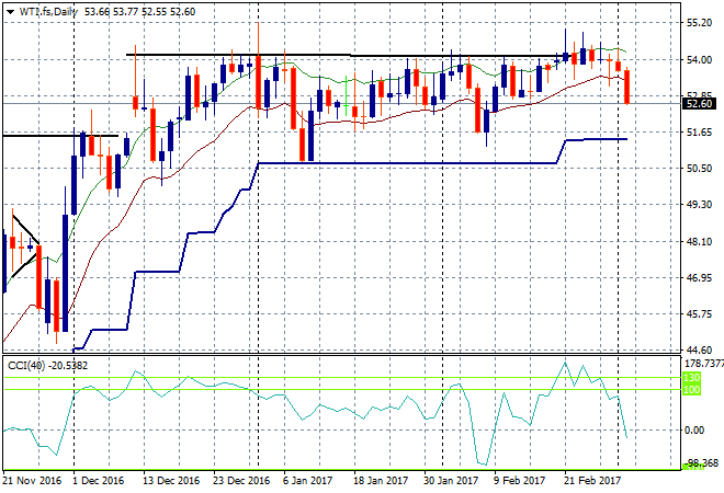 Oil is starting to slip here with a mild selloff as USD surges. The WTI contract fell below the $53USD per barrel level and this time was pushed below its low moving average on the daily chart. The next level to watch is ATR rolling support at $51.50 or so: