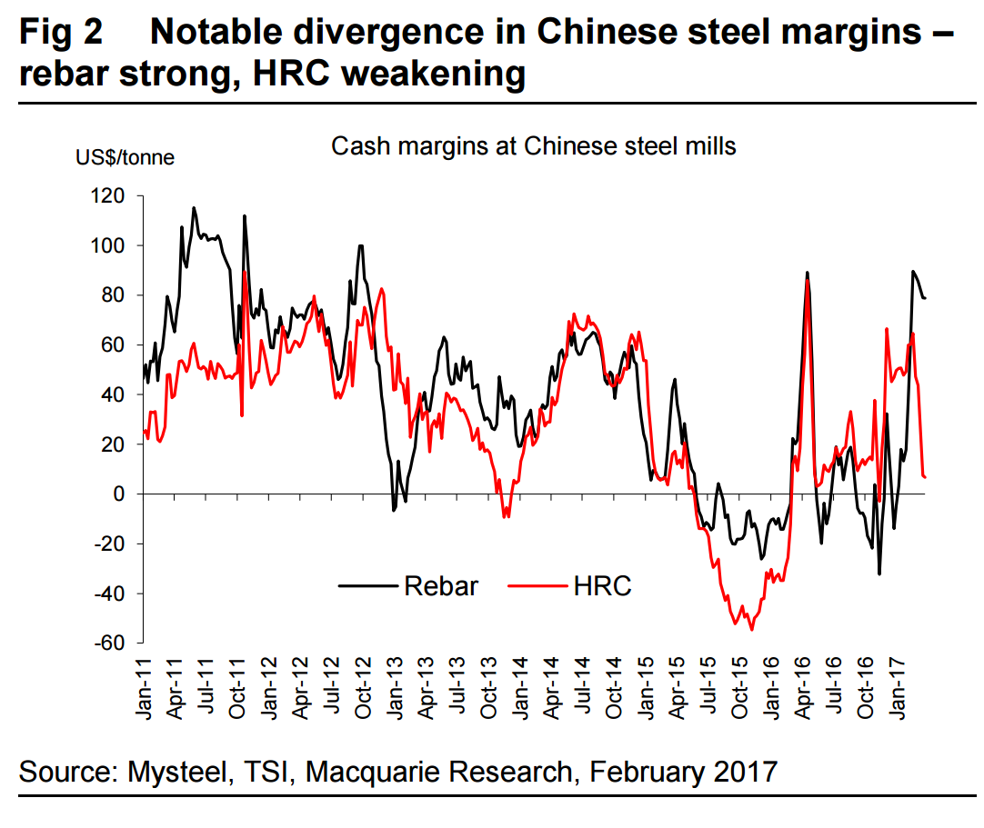 Our steel survey published at the start of last week was interesting in term of order books. Overall domestic orders were strong, but this was clearly led by construction and infrastructure. In contrast, orders from the white goods and machinery sectors were more sanguine. This disconnect is playing out in Chinese steel margins, with recent strength in rebar prices (coupled will falling iron ore) helping margins jump to levels last seen at this time last year. With steel trader inventory still drawing fast, at present there is clearly good demand from the construction sector. Towards mid-year, we think this could morph into a different story, as the effect of property tightening weakens sequential construction activity.