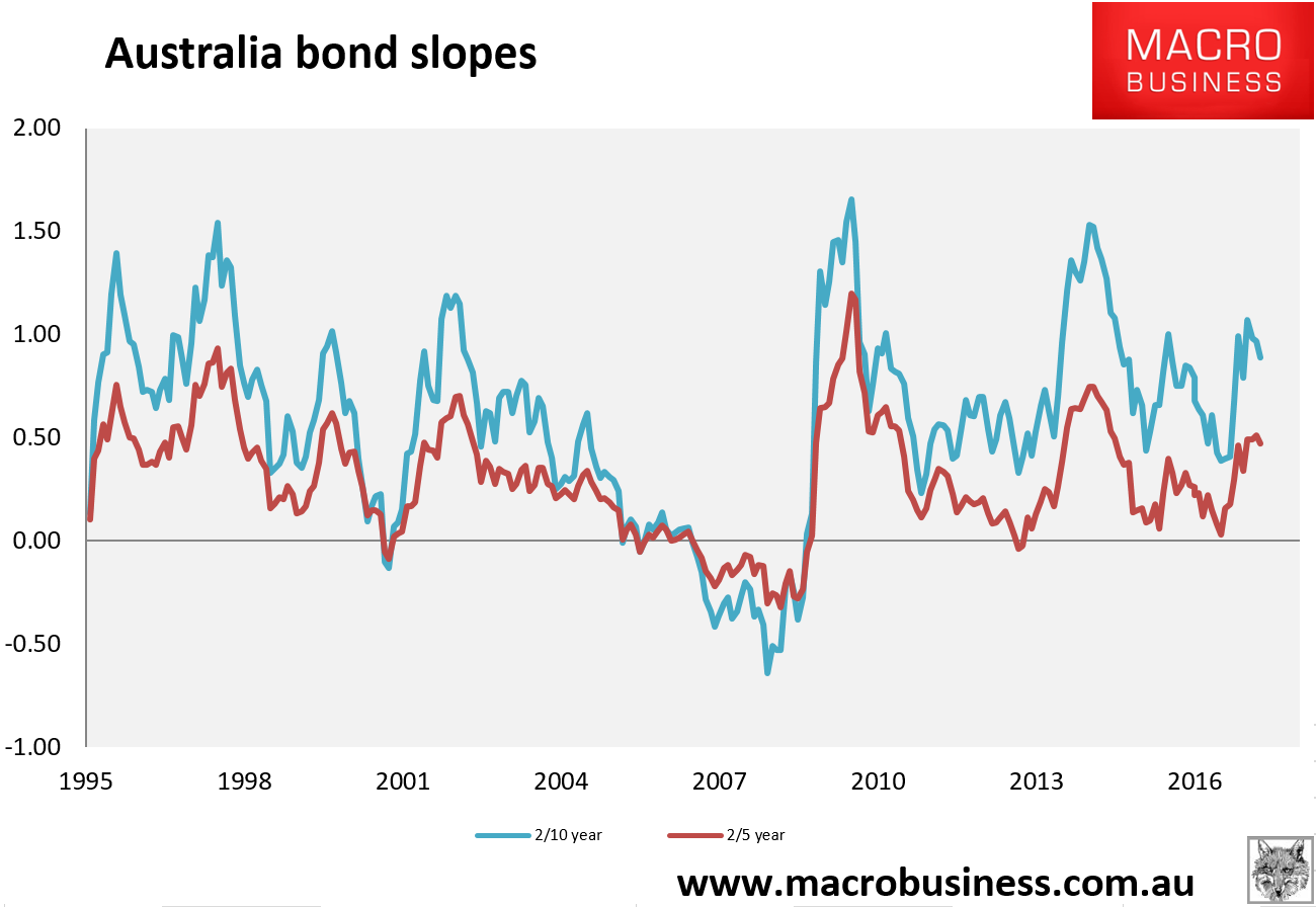 The long end was especially firmly bid as markets realise that the window for RBA hikes is closing fast as a confluence of economic negatives bear down on Australia through H2 and it will have to rely on macroprudential for housing. Thus the curve flattened materially: