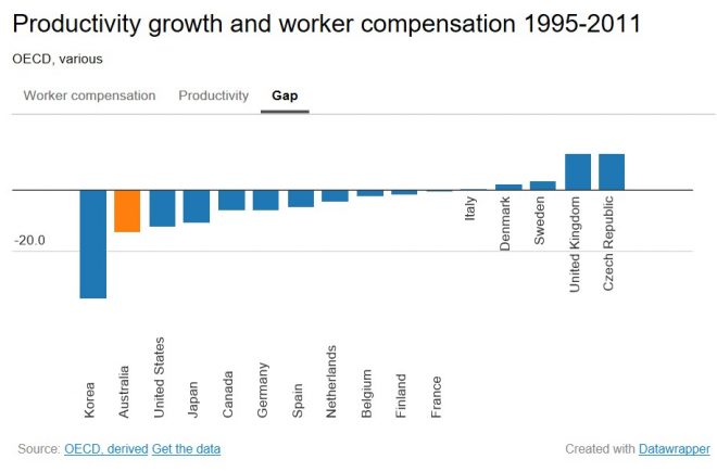 …research released last week by the OECD… showed that while Australia has achieved some of the strongest productivity growth over the past five years, it has not led to similar growth in workers’ incomes…