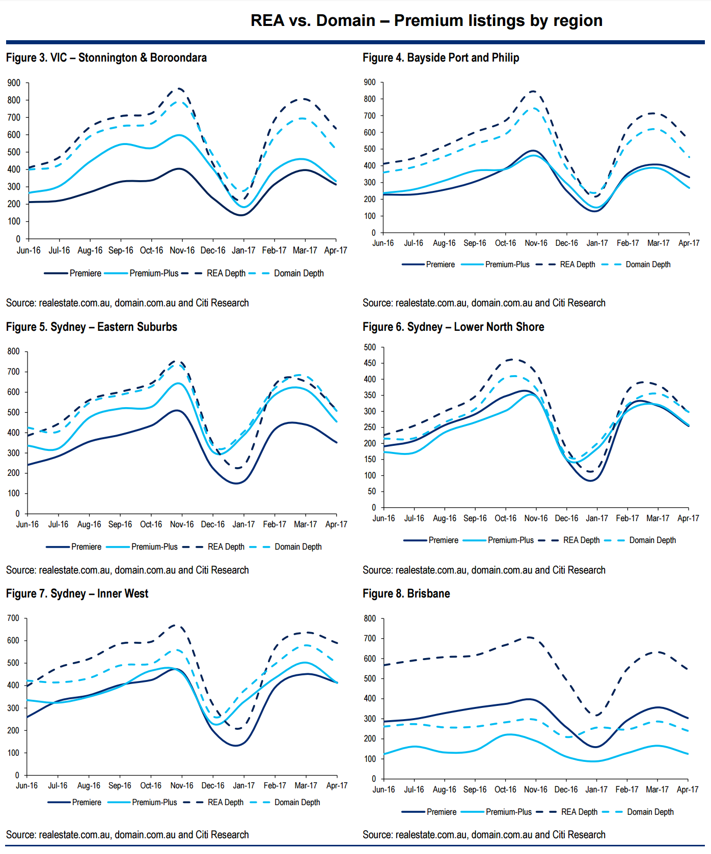 REA: Premiere ad volumes +14% in April — We estimate that REA’s Premiere ad volume growth was +14% in Apr, an improvement on the +11% seen in the March quarter. Total depth listings (Feature, Highlight & Premiere) have steadily improved through this calendar year following a very soft start, with -8% in Jan, -8% in Feb, -2% in Mar and now +14% in April. Take-up of Premiere & Highlight was particularly strong in Melbourne during early Apr, although this has come off again post-Easter.