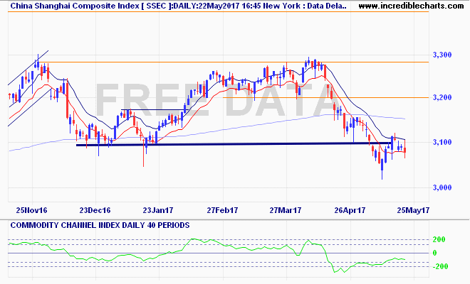 Yesterday in China the Shanghai Composite continues its bad start to the week, down another 0.4% to 3064 points, still unable to climb back above its once critical support level at 3100. This is consolidation period is slowly devolving into a possible breakdown as price heads lower, unable to get above the high moving average: