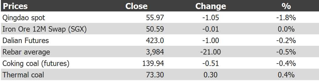 Tianjin benchmark tumbled another $1 to $55.20. Paper finally stabilised overnight, helped by the BHP fire at Mt Whaleback. Steel has rolled. Once we remove taxes and charges, coking coal futures are now pricing $112.