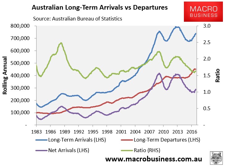 In the year to April 2017, there were 737,530 permanent and long-term arrivals into Australia – up 8% from March 2016 but down from the record 792,500 arrivals set in the year to January 2013 – partly offset by 450,450 permanent and long-term departures from Australia (see next chart).
