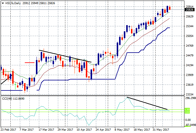 In mainland China the Shanghai Composite is up slightly going into the close, currently at 3152 points, trying to build on its breakout above key support at the 3100 point level. The Hong Kong based Hang Seng Index however is treading backwards, down 0.4% to be just below 26,000 points. The next target remains the 2015 high at 28000, as this should only be a temporary setback: