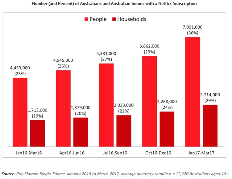 An estimated 7,091,000 million Australians aged 14+ (36 percent) had Netflix in the three months to March 2017, up sharply from 5,862,000 (29 percent) in the previous quarter.