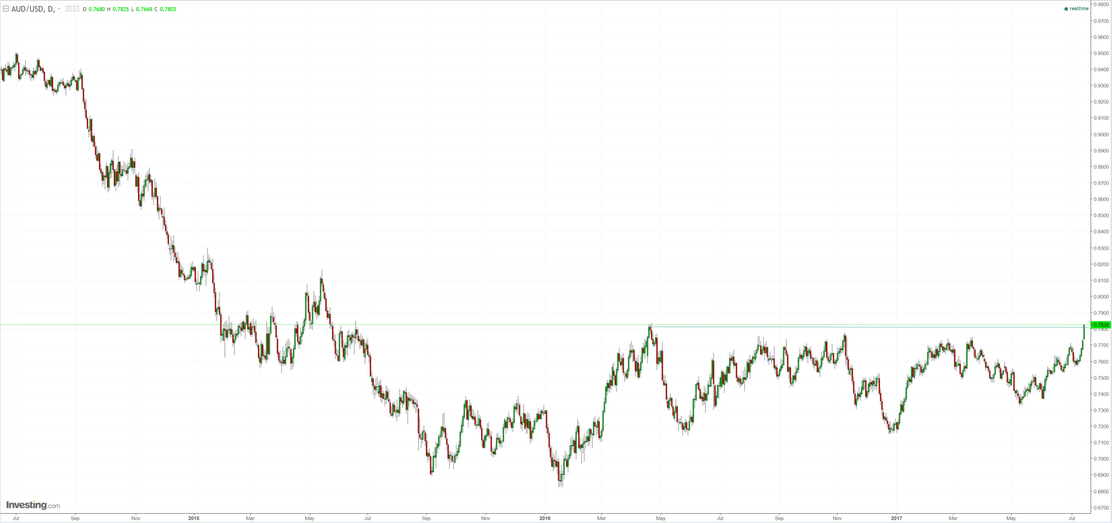 And how. The Aussie flew Friday night to new closing highs against USD, breaking out of its ascending triangle pattern and pointing to more ahead: