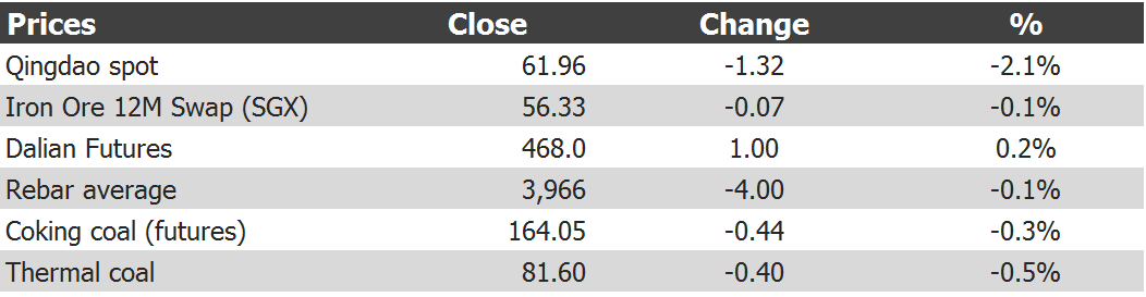 Tianjin benchmark was down 1.1% to $61.30. Paper fell hard late yesterday but recovered and was stable overnight. Steel soft. Coals too.