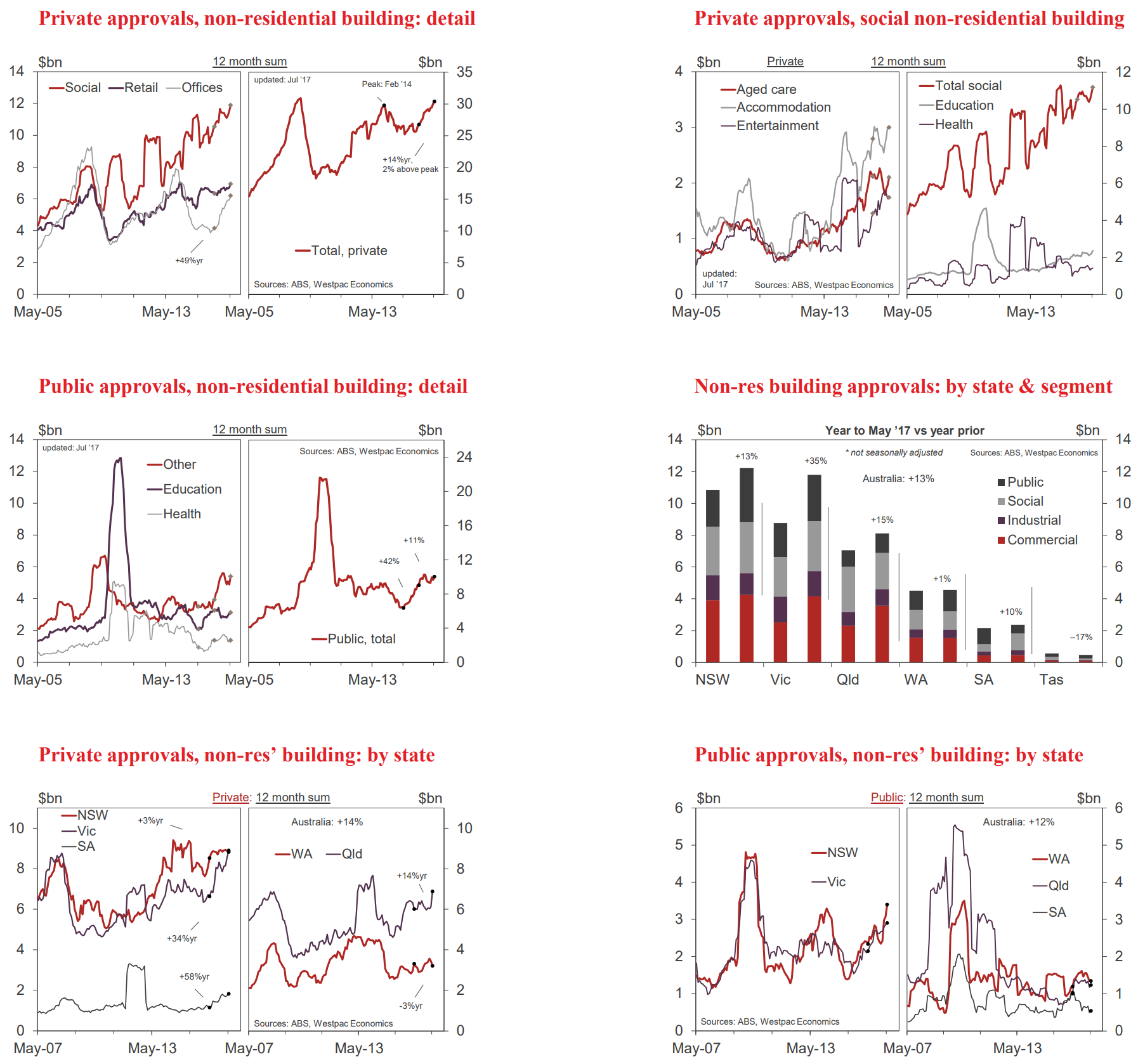 • Retail, +$0.6bn, has contributed to the uptrend in total private building approvals, so too social building projects, +$1.4bn (with gains across education, health and accommodation).