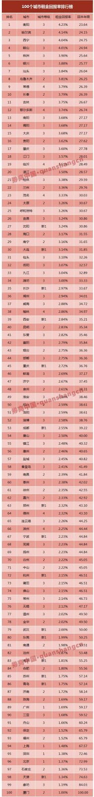 This table compares foreign and Chinese city rental yields. On the left is the city’s international grade. NY and London are A, Toronto and LA A, Orlando is C-, New Castle and New Orleans at the bottom. Comparable Chinese cities are on the right.