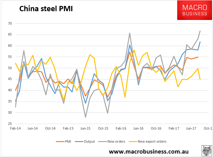The China steel PMI is notoriously volatile. It is perhaps therefore a better directional indicator than it is an absolute reading on conditions.