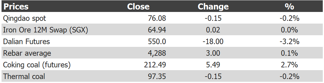 Tianjin benchmark dropped 70 cents to $75.40. Paper stopped the fall last night. Coking coal too. Steel is still hovering at the highs.