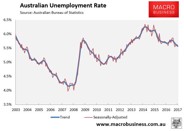In trend terms, the unemployment rate fell marginally from 5.60% to 5.57%: