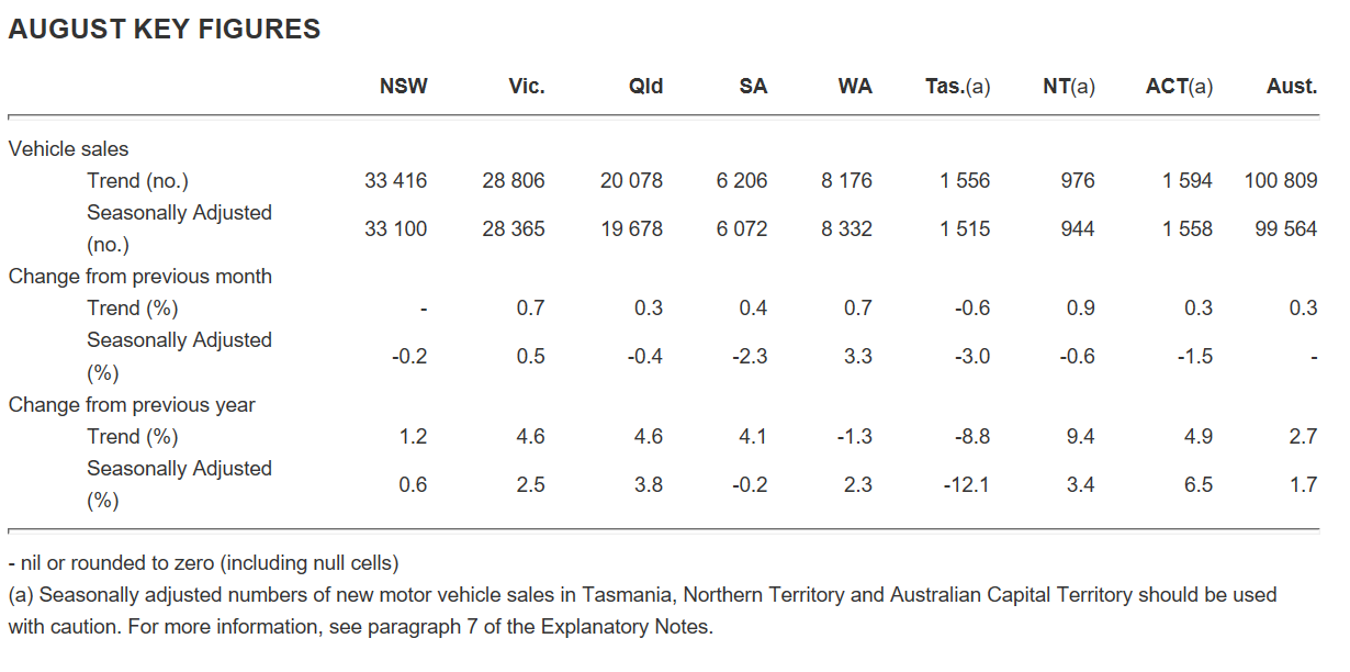 The Australian Bureau of Statistics (ABS) today released new motor vehicle sales for the month of August, which registered no seasonally adjusted change in the number of sales over the month but a 1.7% rise over the year: