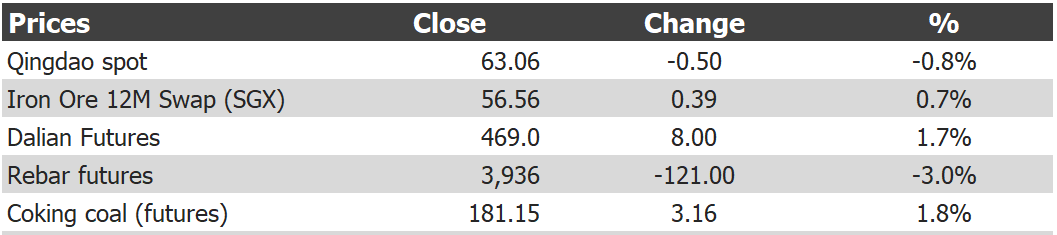 Tianjin benchmark rose 50 cents to $63.40. Paper lifted a little overnight. Coking coal futures too. I’ve swapped from rebar average to futures which report more reliably. They are off a little.