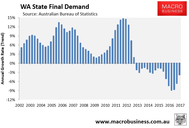 The June quarter’s national accounts, released yesterday, revealed that Western Australia’s economy remains in a slump, with state final demand registering zero growth over the quarter and falling by 3.8% over the year: