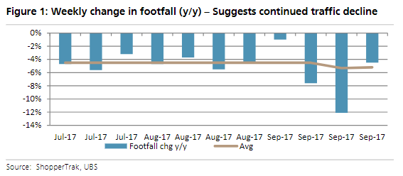 If you believe in foot traffic as a leading indicator then September is a bust, from UBS: