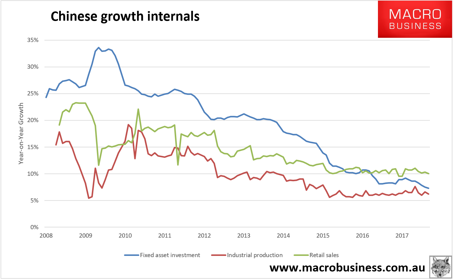 It’s the slow slowing for China. October data came in pretty much on expectations with industrial production at 6.2%, fixed asset investment 7.3% and retail sales 10%: